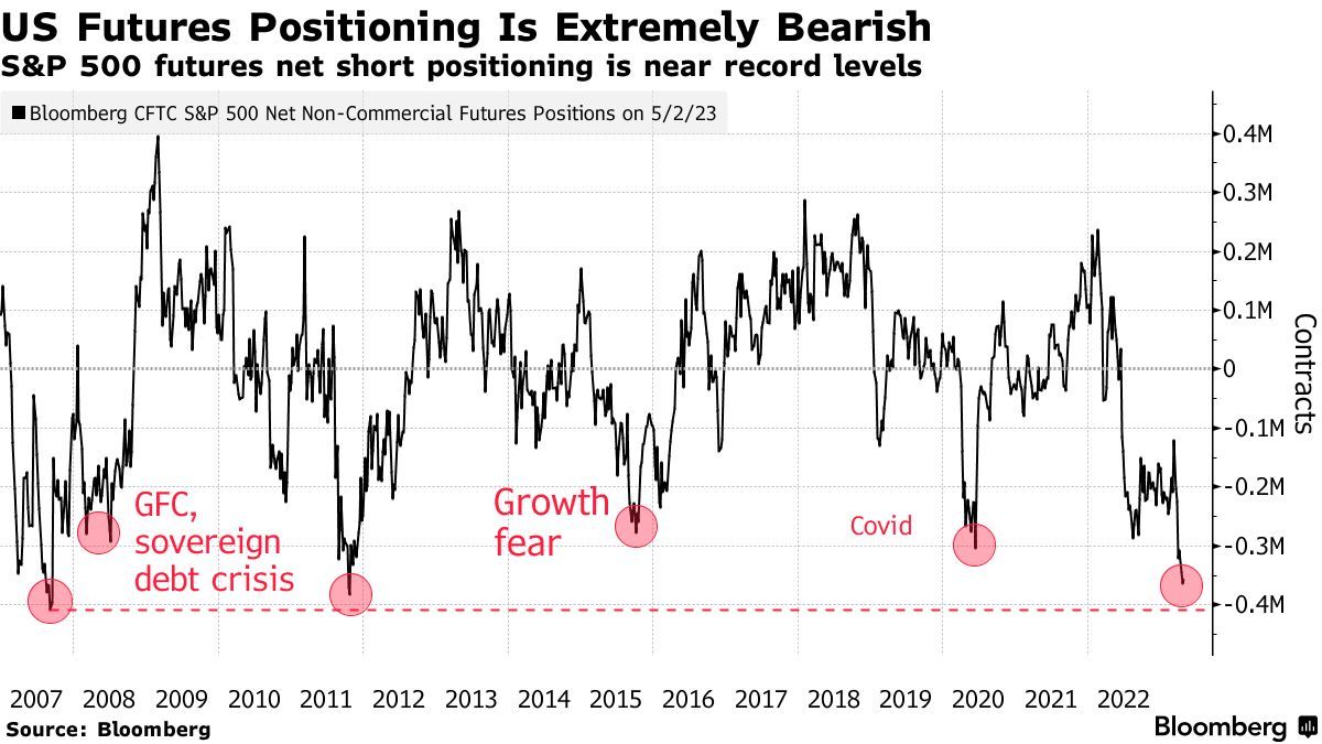尽管人们对美国地区银行的健康状况和经济衰退感到担忧,但是MSCI全球股票市场指数(MSCI All-Country World index)在3月和4月上涨后,本月几乎没有回吐任何程度的涨幅。机构汇编的数据显示,标普500指数(S&P 500)的净空头仓位,甚至接近全球金融危机期间的极度悲观水平。