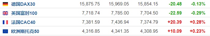 2.截至发稿,德国DAX指数跌0.13%,英国富时100指数跌0.29%,法国CAC40指数涨0.28%,欧洲斯托克50指数涨0.23%。