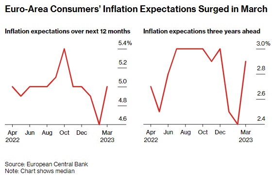 在拉加德发表上述言论之前,欧洲央行的月度调查显示,3月份,消费者对未来12个月的通胀预期从2月份的4.6%上升至5%。未来三年,通胀将从2.4%攀升至2.9%——进一步高于2%的中期目标。