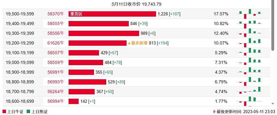 牛证街货重货区在19500-19599区间,该区间最新牛证数量为1228张,较上一交易日增加187张。最多新增在19200-19299区间,较上一交易日增加194张。