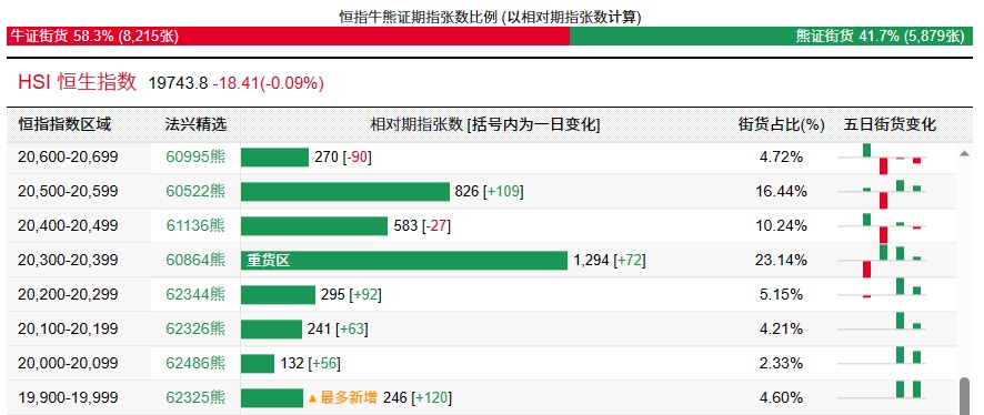 法兴恒指牛熊证街货分布图中的数据显示,熊证街货重货区都在20300-20399区间,该区间最新熊证数量为1294张,较上一交易日增加72张。最多新增在19900-19999区间,该区间最新熊证数量为246张,较上一交易日增加120张。