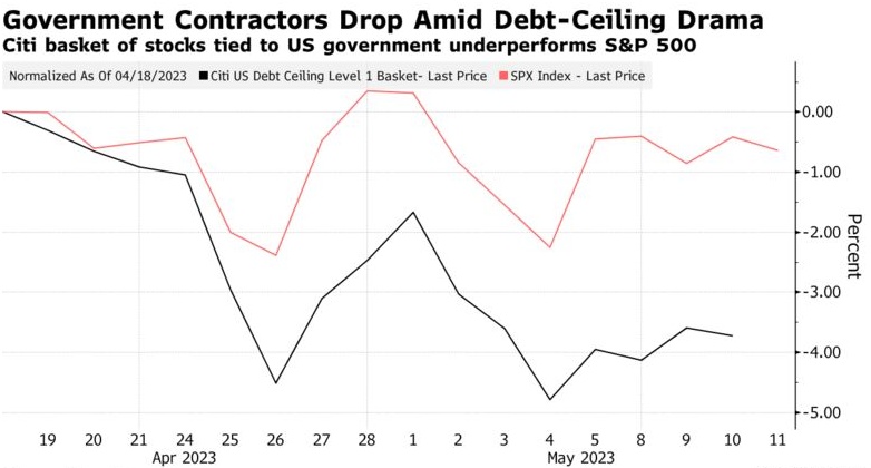 智通财经APP获悉,在围绕美国债务上限的僵局中,美国股市相对平静,但有迹象显示,投资者正在远离那些极度依赖联邦政府合同的公司。花旗研究人员编制的以国防承包商为主的一篮子股票过去四周下跌3.7%,超过标普500指数3%的跌幅。花旗筛选的公司至少要有2.5亿美元的收入,且年收入的5%来自联邦合同。其中包括雷神技术公司(RTX.US)和诺斯罗普格鲁曼公司(NOC.US)。