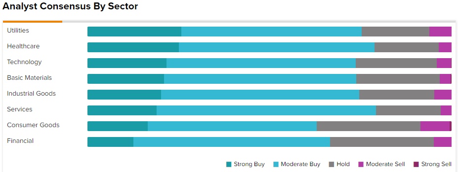 行业方面,根据Tipranks的调查,华尔街分析师最青睐公用事业板块和医疗保健板块。