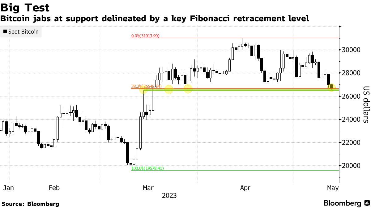 大考验——比特币触及关键的斐波那契回撤位(Fibonacci retracement level)所描绘的支撑