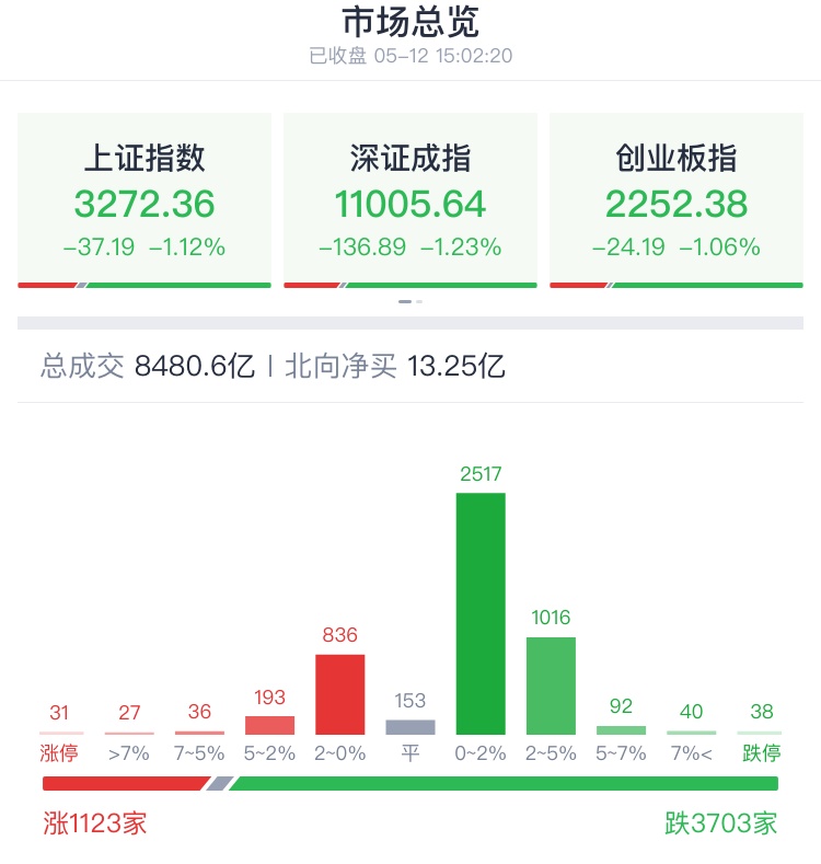 5月12日,今日A股缩量下跌,三大指数均跌超1%,沪指再失守3300点!截至收盘,沪指跌1.12%,报3272.36点;深成指跌1.23%,报11005.64点;创业板指跌1.06%,报2252.38点。