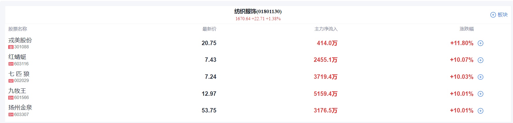 纺织服装板块震荡走强,红蜻蜓2连板,七匹狼、九牧王、扬州金泉、棒杰股份、云中马等多股涨停,酷特智能、南山智尚、美邦服饰、安奈儿等纷纷跟涨。