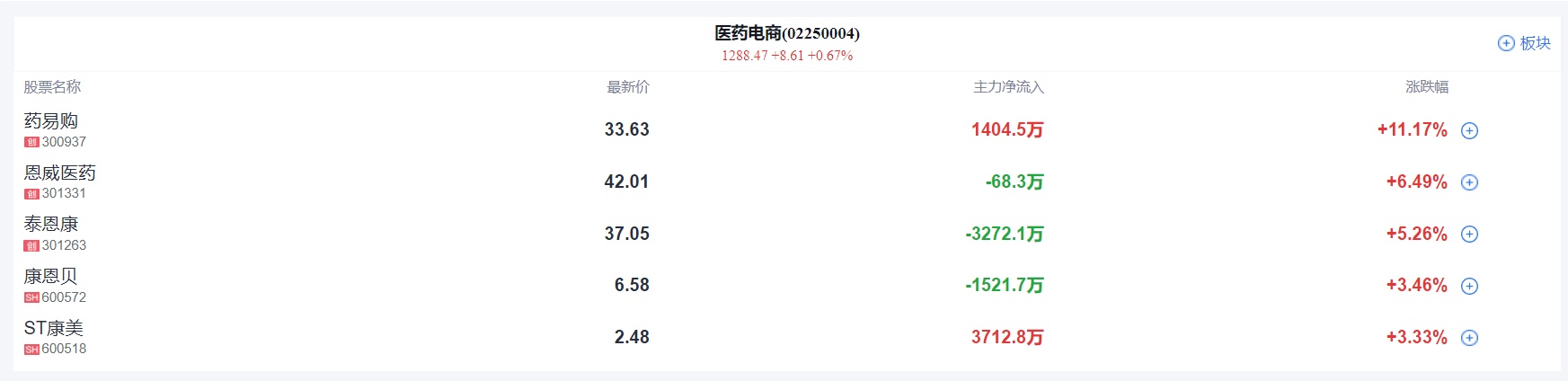 医药板块震荡走高,中药、医药电商方向领涨,药易购涨超11%,海南海药、津药药业、恩威医药、健之佳、赛诺医疗、金石亚药、通化东宝、拓新药业等冲高。