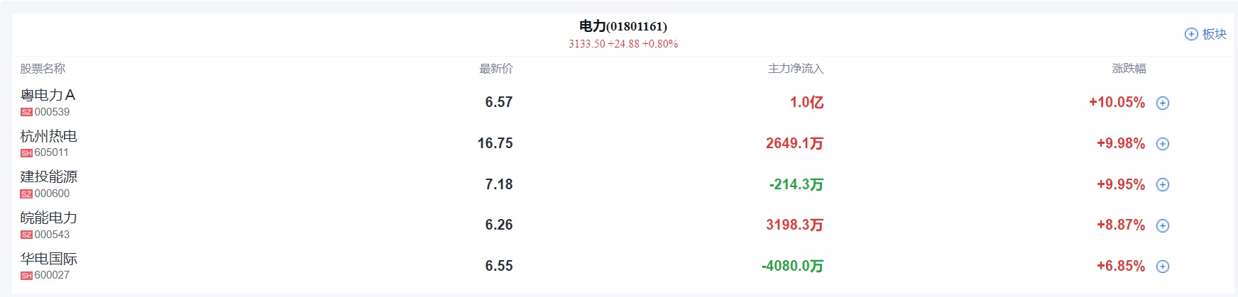 电力股震荡走高,粤电力A涨停,皖能电力、宝新能源、京能电力、华电国际、浙能电力、华能国际等跟涨。