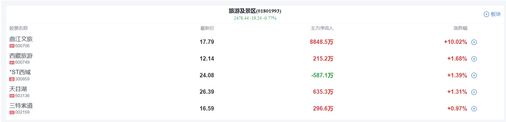 旅游板块午后异动拉升,曲江文旅涨停,金马游乐、西安旅游、三特索道、天目湖、大连圣亚等拉升。