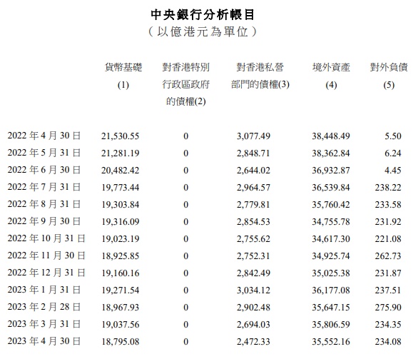智通财经APP获悉,5月12日,香港金管局公布外汇基金在2023年4月底的主要分析帐目。在4月份,外汇基金的境外资产减少254亿港元,至35,552亿港元。货币基础为18,795亿港元,包括负债证明书、政府发行的流通纸币及硬币、银行体系结余,以及已发行外汇基金票据及债券。外汇基金对香港私营部门的债权总额为2,472亿港元。对外负债总额为234亿港元。