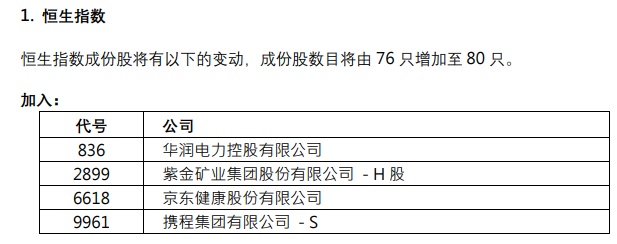 起生效。其中,华润电力(00836)、紫金矿业(02899)、京东健康(06618)、携程集团-S(09961)将被纳入恒生指数成份股。成份股数目将由76只增加至80只。