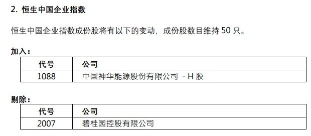 中国神华(01088)将被纳入恒生中国企业指数成份股。成份股数目维持50只。