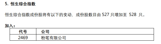 粉笔(02469)将被纳入恒生综合指数成份股。成份股数目由527只增加至528只。