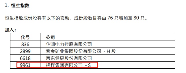 (星期一) 起生效。其中,携程集团-S(09961)获纳入恒生指数成份股。