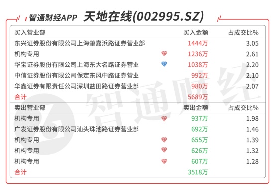 天地在线(002995.SZ):多主力现身龙虎榜,今日共5个机构席位出现在龙虎榜单上,对倒当日买卖均衡,买三是知名游资的席位买入1028万元,买五是知名游资的席位买入980万元,当日净买入3757万元,该股今日突破所有均线,预计有溢价。