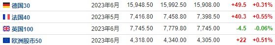2.截至发稿,德国DAX指数涨0.31%,英国富时100指数跌0.06%,法国CAC40指数涨0.55%,欧洲斯托克50指数涨0.51%。