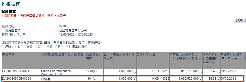 智通财经APP获悉,香港联交所最新资料显示,5月9日,董事会主席兼执行董事曲继广增持石四药集团(02005)100万股,每股作价4.9382港元,总金额为493.82万港元。增持后最新持股数目约为10.96亿股,最新持股比例为36.88%。