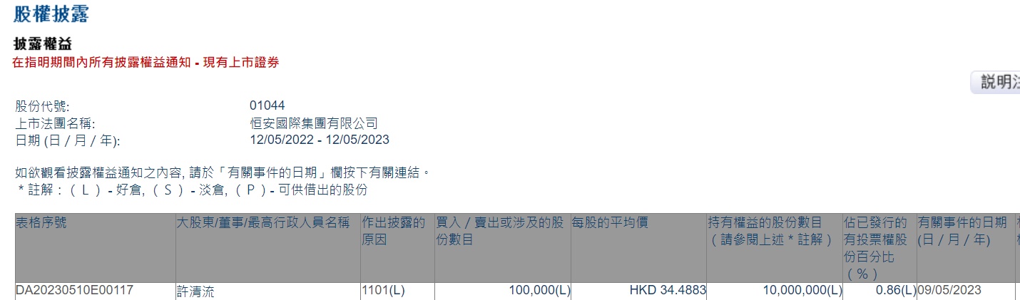 智通财经APP获悉,香港联交所最新资料显示,5月9日,行政总裁兼执行董事许清流增持恒安国际(01044)10万股,每股作价34.4883港元,总金额约为344.88万港元。增持后最新持股数目为1000万股,最新持股比例为0.86%。