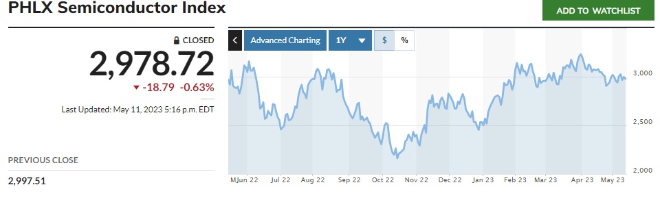 因此,受益于前段时间美国银行业危机形势,市场对于美联储转向年底前降息的预期升温,以及近期的全球AI浪潮所强力推动下,堪称全球芯片股基准指数的费城半导体指数大幅反弹,年内涨幅超过17%。