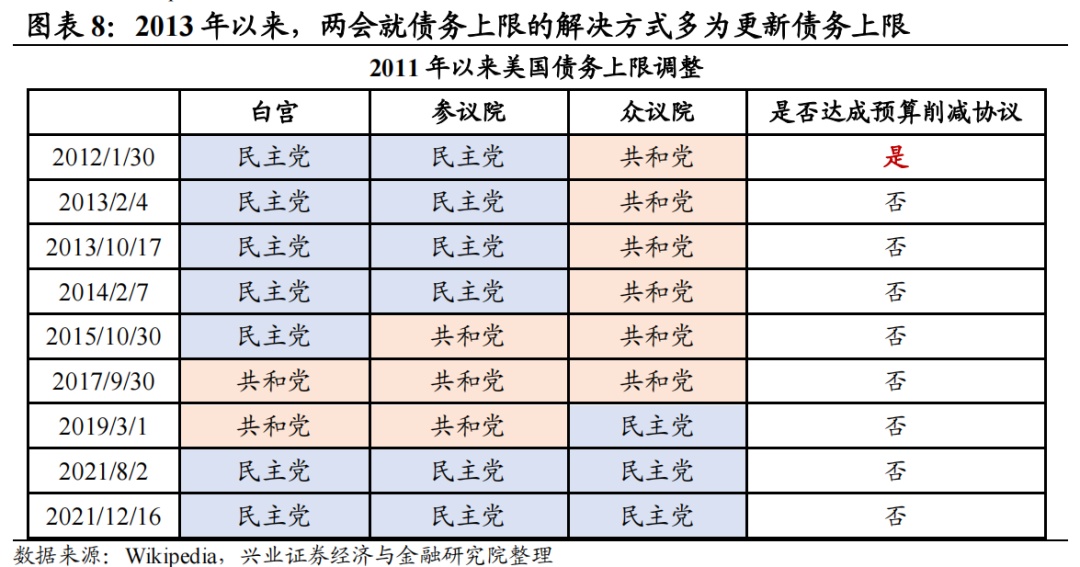 最后的结果大概率是更新债务上限,而非削减债务。理论上在野党可利用债务上限要求执政党削减预算,但近年已很少发生。理论上来讲,债务上限的调整需要国会两院一致同意通过,在白宫、参议院和众议院分属不同政党占优的情况下,非执政党可以利用债务上限为由,要求与执政党达成削减预算等财政政策,否则不予通过债务上限调整的法案。但实际上近10年中,只有2011-2012年发生过1次,而此后的6次债务上限调整中,均未通过预算削减协议。背后的原因是,民众虽不喜欢政府推高债务,但更不喜欢被削减福利。2011-2012年,共和党利用在众议院占优的优势,在债务上限调高之际,与民主党达成《2011预算控制法》,联邦政府需要在未来9年削减1.9万亿美元的政府预算。但共和党因此也付出了支持率大幅下滑的代价,在预算削减法案通过后的民调中,共和党在众议院与参议院的民调支持率分别下降10%与6%。当前来看,站在长周期的角度,美国仍处在经济增长放缓的环境下,美国政府已经离不开持续举债与美联储持续购债的MMT模式,这意味着美国未来的财政赤字增长仍难控制,美国国会或仍延续此前做法,再次对美国债务上限进行延期。