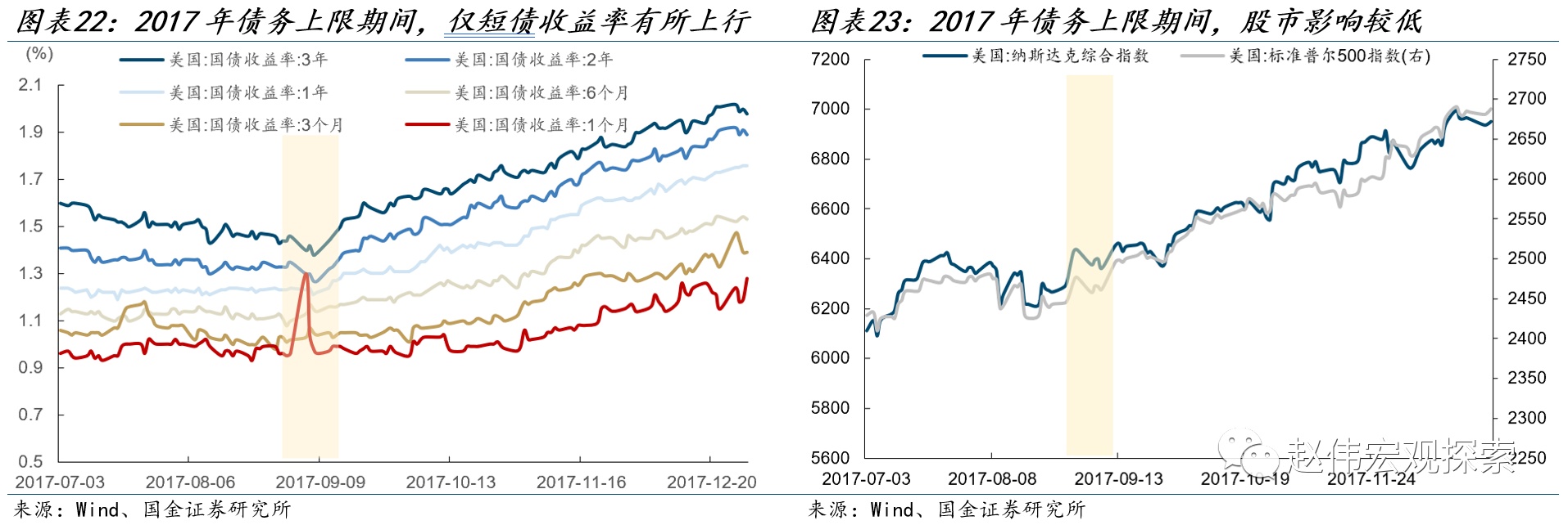 场景二,美国两党在临近违约前几日甚至仅提前若干小时达成协议,谈判很可能会被拖延到“最后一刻”。双方最终各有所让步,同意提高或暂停债务上限。该情景的影响类似于2011及2013年两次影响较大的债务上限危机,主因是今年美国参众两院同样分属两党(与2011相同);两党基调同样强硬(与2011、2013年相同);从触发债务上限到X Date的时间同样紧迫(2011年为3个月,2023年可能为4个月)。