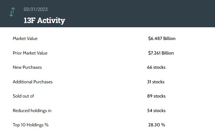 据统计,该基金一季度持仓总市值为64.87亿美元,上一季度总市值为72.61亿美元,环比下降10.66%。在一季度的持仓组合中新增了66只个股,增持了31只个股,同时减持了54只个股并清仓了89只个股。其中前十大持仓标的占总市值的28.30%。