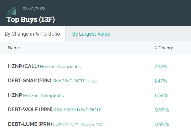 从持仓比例变化来看,前五大买入标的分别是:Horizon Therapeutics看涨期权(HZNP.US,CALL)、Snap(SNAP.US)票据、Horizon Therapeutics、Wolfspeed(WOLF.US)票据和Lumentum(LITE.US)票据。