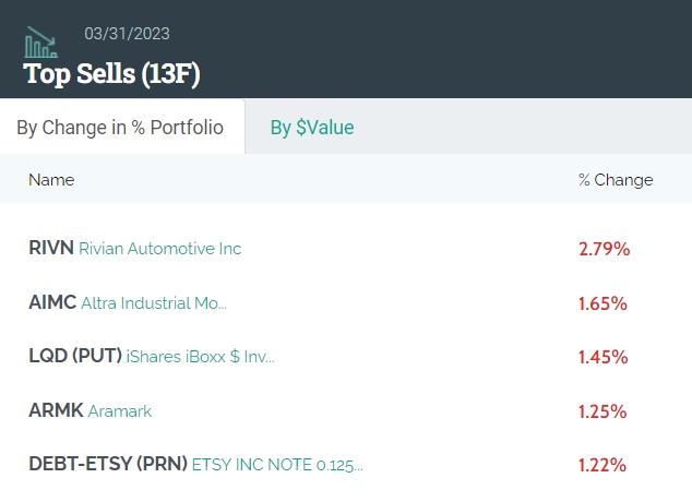 前五大卖出标的分别是:Rivian、Altra Industrial Motion(AIMC.US)、iShares iBoxx 投资级公司债券 ETF看跌期权(LQD.US,PUT)、Aramark(ARMK.US)和Etsy(ETSY.US)票据。