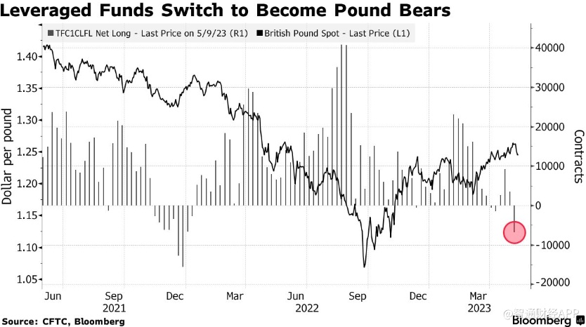 智通财经APP获悉, 对冲基金看空英镑的程度达到2021年12月来之最,策略师们表示,这要归咎于对英国经济衰退的担忧。美国商品期货交易委员会(CFTC)的数据显示,在连续三周做多后,杠杆投资者在截至5月9日的当周转为持有6858张英镑净空头合约。与此同时,国际货币基金组织(IMF)警告称,英国可能是今年七国集团(G7)中唯一陷入衰退的国家。