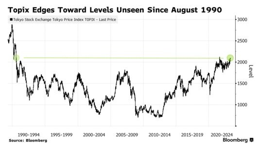 截至发稿,日本基准东证指数攀升0.81%,至2113.36点,距离2021年9月达到的上一个峰值只有不到1%的距离。东证指数目前的交易水平也接近日本泡沫经济破裂以来的最高水平。