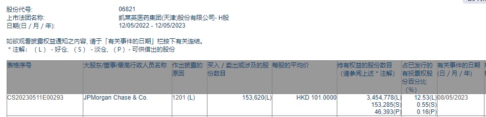 智通财经APP获悉,香港联交所最新资料显示,5月8日,小摩减持凯莱英(06821)15.362万股,每股作价101港元,总金额约1551.56万港元。减持后最新持股数目约为345.48万股,最新持股比例为12.53%。