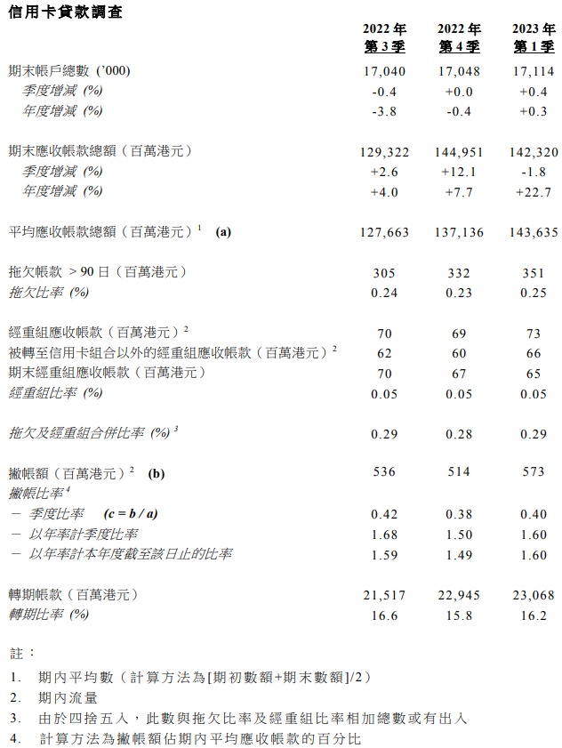 拖欠及经重组合并比率由上季末的0.28%轻微上升至2023年3月底的0.29%。信用卡季度撇帐率亦由上季的0.38%微升至0.40%。