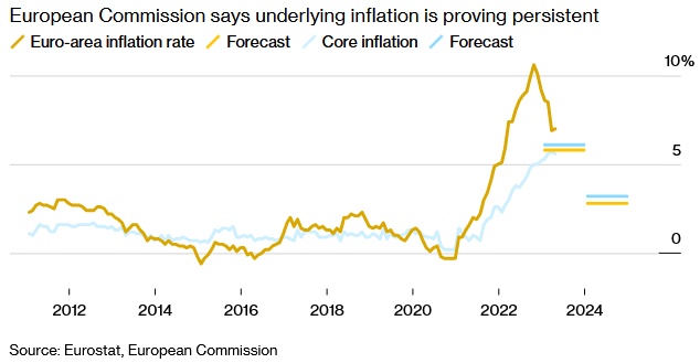 欧盟委员会表示:“随着(欧洲企业的)利润空间吸收了工资涨幅、以及更严格的融资条件证明对需求降温有效,核心通胀将逐渐下降。然而,服务业的持续高价格压力、加上食品和商品的价格压力只会缓慢消退,预计核心通胀将保持在高位。”