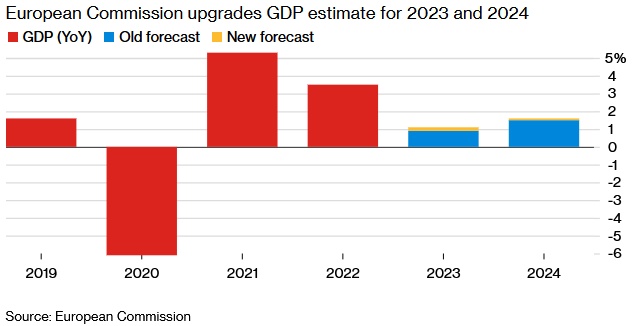 此外,欧盟委员会还上调了2023年和2024年的经济增长预期。该委员会预计,2023年欧元区GDP将增长1.1%,2024年将增长1.6%,这两个预测都略高于此前的水平。