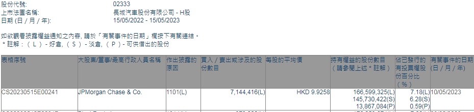智通财经APP获悉,香港联交所最新资料显示,5月10日,小摩增持长城汽车(02333)714.4416万股,每股作价9.9258港元,总金额约为7091.40万港元。增持后最新持股数目约为1.67亿股,最新持股比例为7.18%。