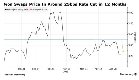韩国互换合约的定价反映出,韩国央行预计将在未来12个月内下调利率25个基点。虽然,韩国央行在4月11日的政策决定中反驳了降息预期,理由是其目标是对抗通胀。但是,5月初公布的4月通胀数据有所缓解,这为该国央行提供了价格压力正在缓解的证据。不过,韩国政策制定者比预期更快的降息可能会给韩元增加压力。今年以来,韩元已经是亚洲表现最差的货币。