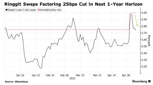 马来西亚央行本月决定再度收紧政策,加息25个基点,令投资者感到意外。但市场预期,这可能是最后一次加息,因为上周林吉特互换合约定价显示,未来12个月内利率至多会下降25个基点。尽管如此,降息似乎远非板上钉钉,马来西亚3月份的核心通胀率为3.80%,明显高于五年平均水平,而且能源补贴的潜在削减可能会增加价格压力。