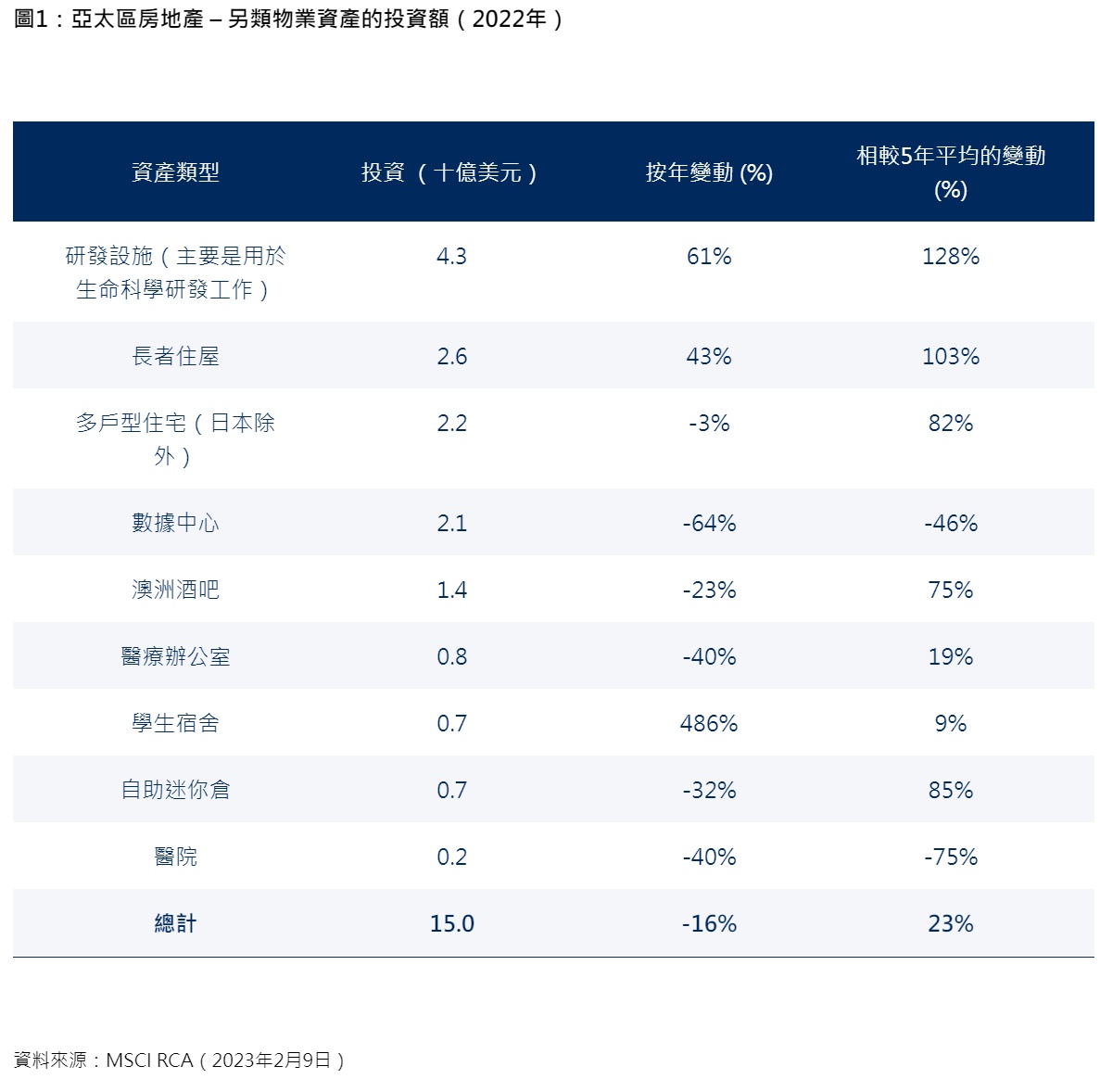 虽然2022年亚太区另类物业资产的总投资量下跌16%,但这不应被视为其失宠的迹象。大多数另类物业资产类别的受欢迎程度正持续增长。2022年规模最大的另类物业资产类别为研发设施(主要是用于生命科学研发工作),投资额增长达61%至43亿美元。第二大另类物业资产类别为长者住屋,投资额增长43%至26亿美元。数据中心为过往最强劲的另类物业资产类别,但其投资交易下跌64%,已被研发设施及长者住屋这两个类别超前。