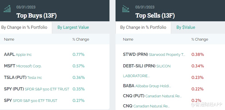 从持仓比例变化来看,前五大买入标的分别是:苹果、微软、特斯拉看跌期权(TSLA.US,PUT)、标普500指数ETF看跌期权和标普500指数ETF。