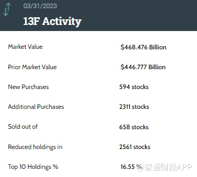 统计数据显示,高盛第一季度持仓总市值达到4684.76亿美元,上一季度总市值达4467.77亿美元,市值环比上涨5%。高盛在第一季度的持仓组合中新增了594只个股,增持了2311只个股,减持2561 只个股,清仓658只个股。其中,前十大持仓标的占总市值的16.55%。