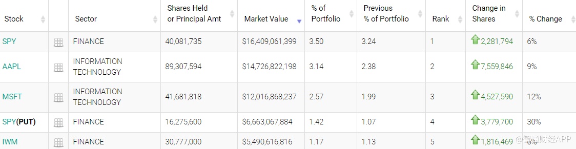 在前五大重仓股中,标普500指数ETF(SPY.US)仍位列第一,持仓约4008.17万股,持仓市值约164.09亿美元,占投资组合比例为3.50%,持仓数量较上季度增长6%。