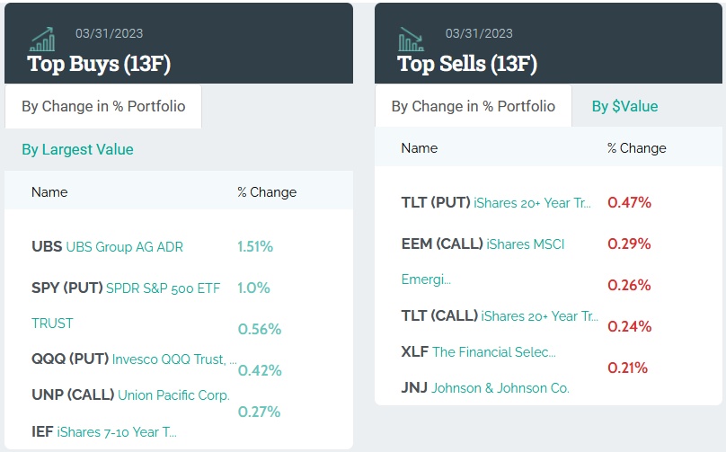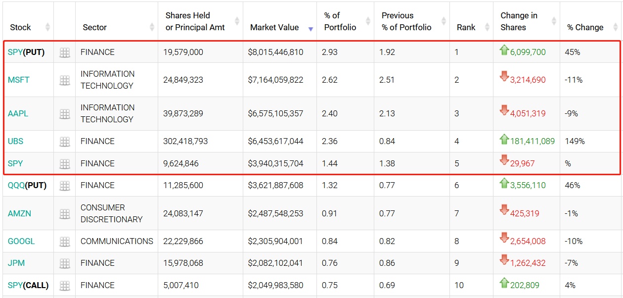 从持仓比例变化来看,前五大买入标的分别是:瑞银、标普500指数ETF看跌期权(SPY.US,PUT)、纳指100ETF看跌期权(QQQ.US,PUT)、联合太平洋看涨期权(UNP.US,CALL)、iShares美国国债7-10年ETF(IEF.US)。