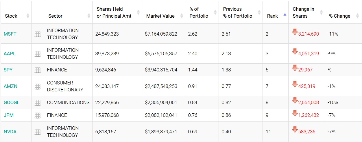 微软(MSFT.US)位列第二,持仓约2484.93万股,持仓市值约为71.64亿美元,占投资组合比例为2.62%,持仓数量较上季度下降11%。
