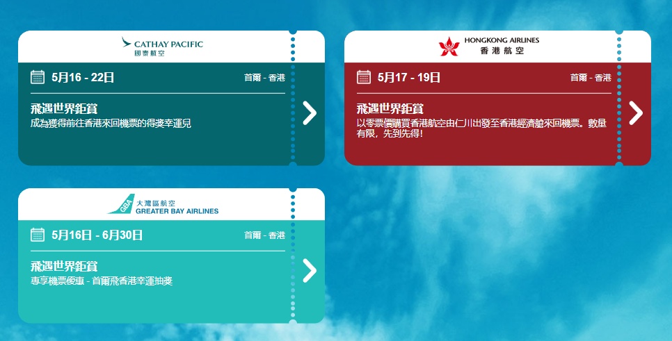 这其中,国泰航空送出10602张从韩国出发前往香港的来回机票,参加者并无国籍限制,但必须已登记成为国泰会员,以及年满19岁或以上。此外,由周四(18日)起,“飞遇世界钜赏”计划亦将于美国及加拿大推出。