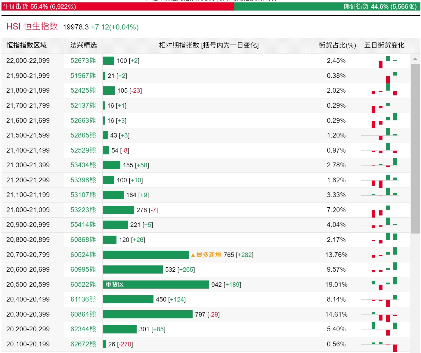 法兴恒指牛熊证街货分布图中的数据显示,熊证街货重货区在20500-20599区间,该区间最新熊证数量为942张,较上一交易日增加189张;最多新增在20700-20799区间,该区间最新熊证数量为765张,较上一交易日增加282张。
