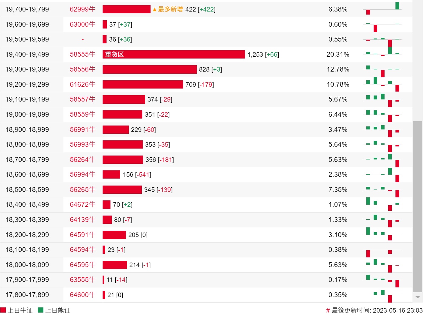 牛证街货重货区在19400-19499区间,该区间最新牛证数量为1253张,较上一交易日增加66张;最多新增在19700-19799区间,该区间最新牛证数量为422张,较上一交易日增加422张。