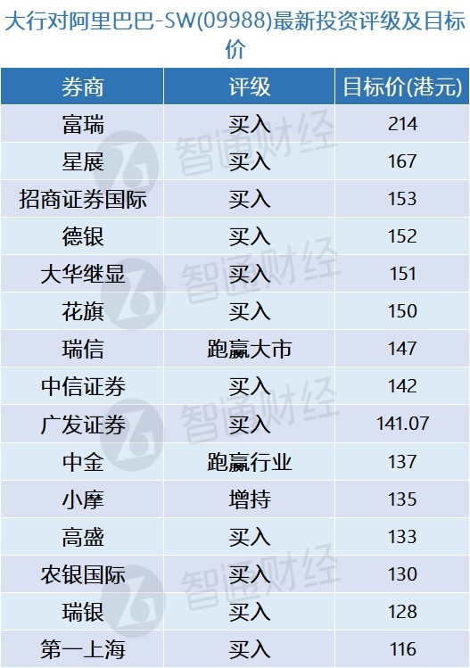 以下为智通财经APP统计的各机构对阿里巴巴港股的评级和目标价,其中富瑞给出的港股目标价高达214港元,多数机构给出的目标价均远高于当前的目标价。