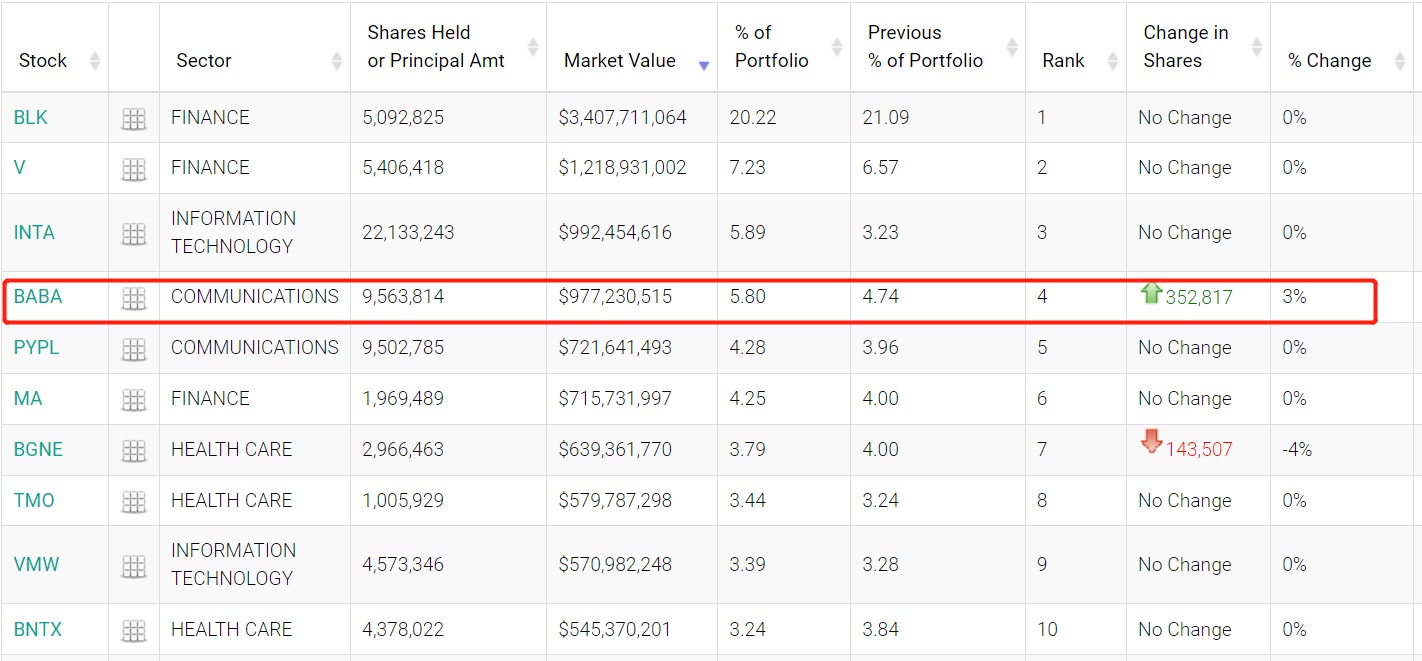 总部位于新加坡的国际投资公司淡马锡(TEMASEK HOLDINGS)第一季度13F报告显示,其前十大持仓多数无任何操作变动,但仍然坚持加仓阿里巴巴,目前阿里位列淡马锡第四大重仓股,持仓数量较上季度增加超35万股,增持比例为3%,占投资组合比例则达到5.80%。