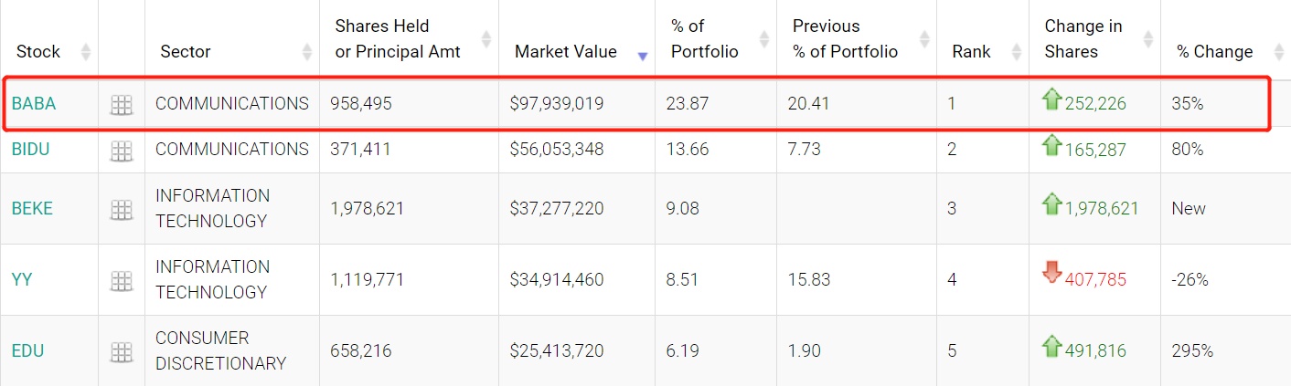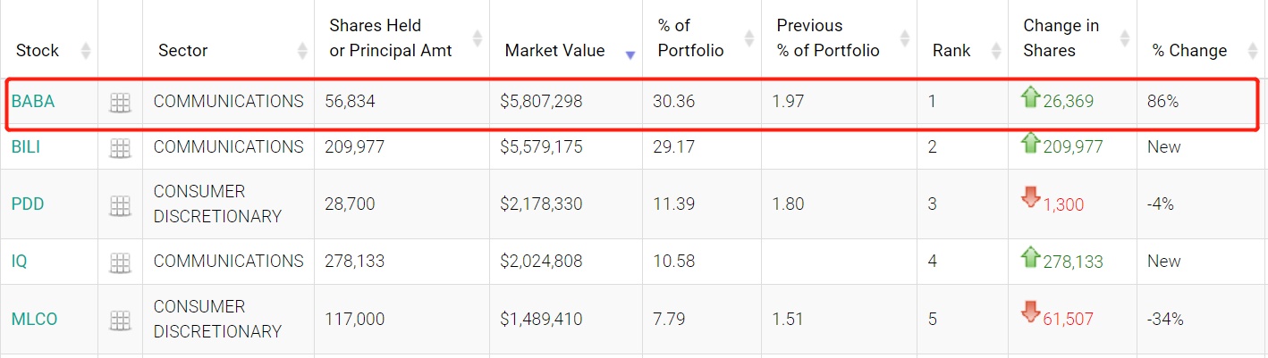 HHLR在一季度共对包括阿里巴巴、拼多多(PDD.US)在内的9只中概股进行了增持与新进买入等操作。整体看,在HHLR截至一季度末的全部美股持仓中,中概股合计持有市值占比接近70%。值得关注的是,HHLR一季度持仓市值规模比上季度提升了近20%。