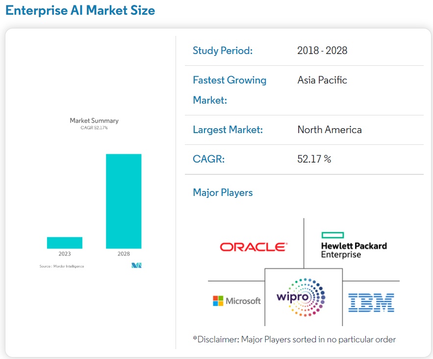 阿里巴巴已将人工智能开发作为优先事项,在OpenAI的ChatGPT重磅推出后,一系列投资和人才进入了蓬勃发展的人工智能相关行业。知名市场研究机构Mordor Intelligence 预测,到2028年,企业端人工智能市场的总规模将以每年高达52%的速度快速增长。